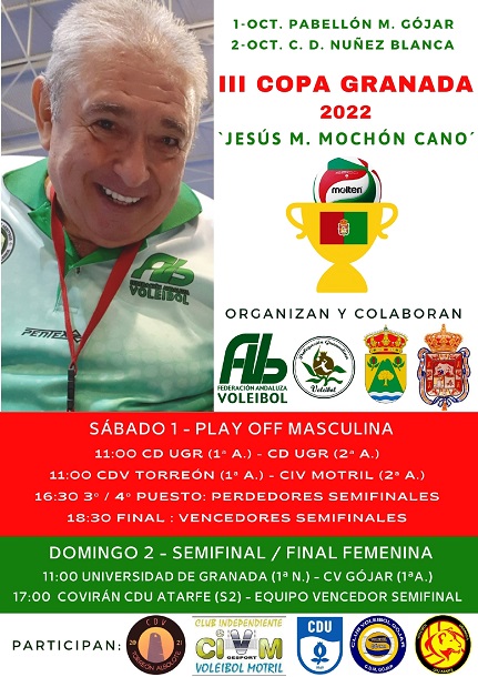 La capital granadina y más concretamente, el Complejo Deportivo Núñez Blanca acogerá durante todo el domingo 2 de octubre, el torneo femenino. Habrá una sola semifinal a las 11.00 horas, entre el Club Deportivo Universidad de Granada, que un curso más repetirá en Primera División Nacional, midiéndose al Club Voleibol Gójar integrante de la Primera División Andaluza. El triunfador de este envite luchará por la Copa Granada ‘Jesús M. Mochón’, a las 17.00 h. frente al equipo más representativo del voleibol granadino esta temporada, el Covirán CDU Atarfe. El equipo atarfeño con la mira puesta en el inicio de la segunda categoría del vóley nacional, la Superliga 2 que arranca para ellas el 9 de octubre.