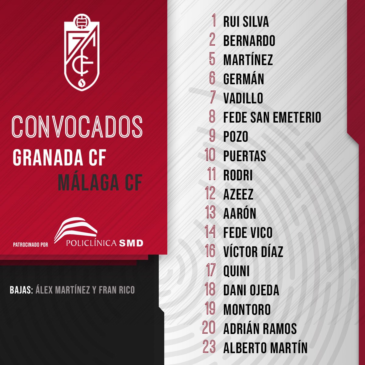 También queda fuera de la convocatoria el centrocampista Erik Morán, con dolencias físicas, al igual que el medio Dani Pacheco, quien ya fue baja en la pasada jornada.