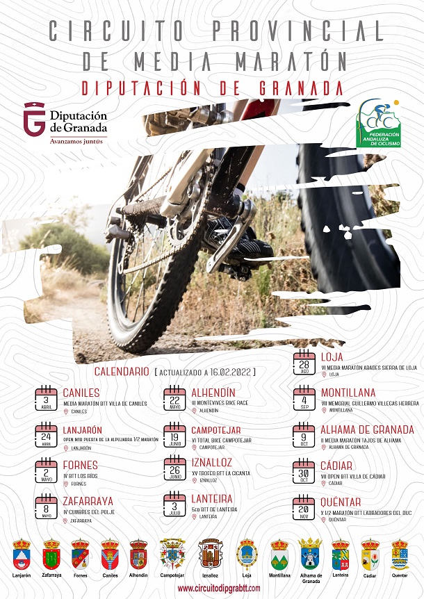 Este Circuito Provincial de Media Maratón Diputación de Granada 2022, que está organizado por la Delegación de Deportes de la Diputación de Granada con la colaboración de la Federación Andaluza de Ciclismo y de los ayuntamientos y clubes organizadores, está compuesto por un total de 13 encuentros puntuables. Las localidades de Caniles, Lanjarón, Fornes, Zafarraya, Alhendín, Campotéjar, Iznalloz, Lanteira, Loja, Montillana, Alhama de Granada, Cádiar y Quéntar son las sedes de estos eventos.