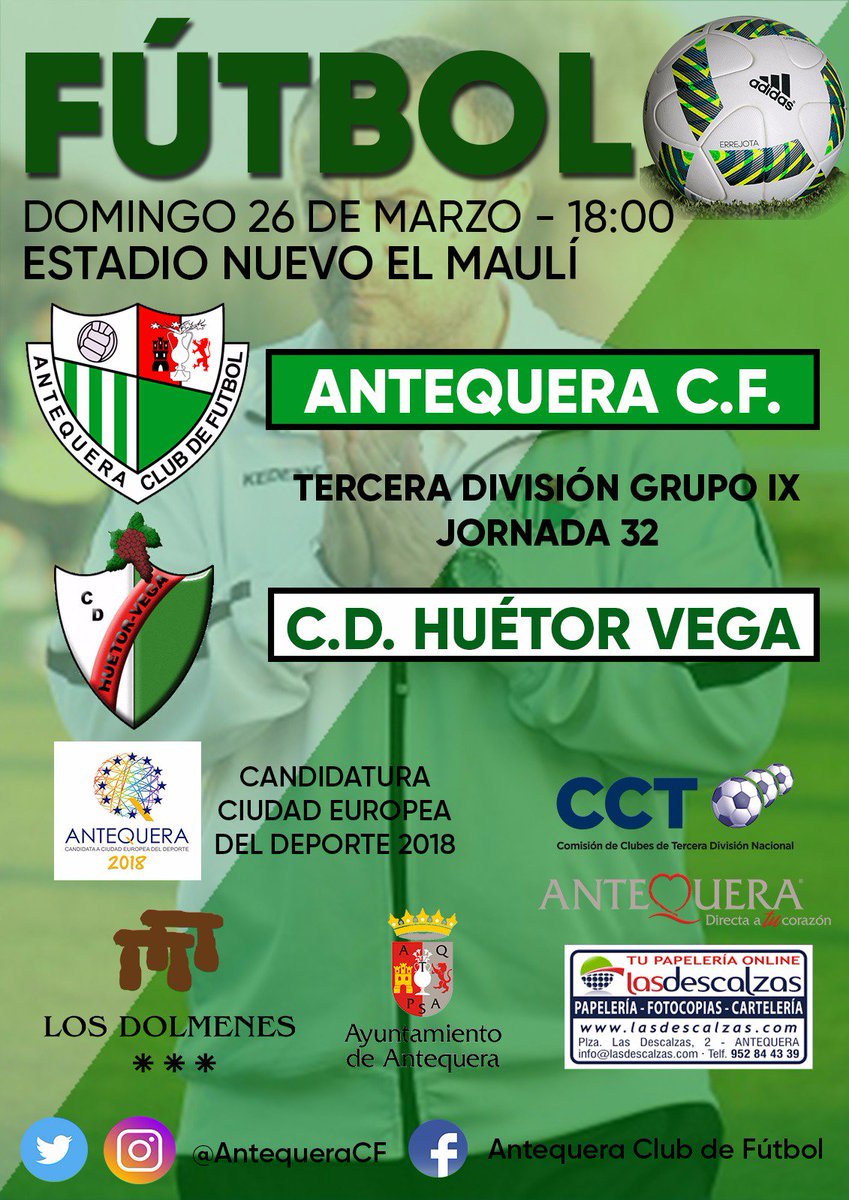 En el Maulí de Antequera a partir de las seis de la tarde del domingo, el CD Huétor Vega juega un choque de gran intereses tanto para el equipo de ‘Rizos’ como para los granadinos de la zona alta. Los hueteños siguen luchando como recién ascendido por la permanencia y esta semana tendrá enfrente un ‘miura’, los de Aybar en un gran momento con cuatro victorias y un empate en las últimas cinco jornadas, siguen jugándose entrar en la fase de ascenso y será complicado, pero los de las faldas de Sierra Nevada son siempre un rival aguerrido que no se da por vencido y seguramente se lo pondrá complicado a los locales, un empate sería un gran resultado, la victoria una gran alegría.