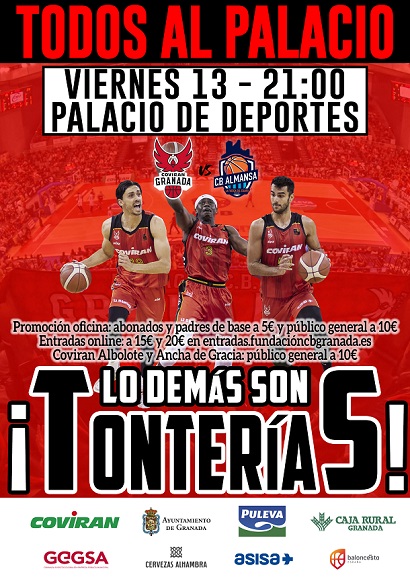 El Coviran Granada recibe el próximo viernes, 13 de mayo, al CB Almansa con Afanion a partir de las 21:00 horas en el Palacio de Deportes. La Fundación CB Granada pone a disposición de todos sus aficionados precios especiales para el choque correspondiente a la penúltima jornada de competición con el objetivo de que el Palacio de Deportes presente un lleno absoluto en sus gradas. Además, el club pide a todos sus aficionados acudir a las 20:30 horas al recinto del Zaidín para recibir al equipo en su salida a la pista e ir todos vestidos de rojo.